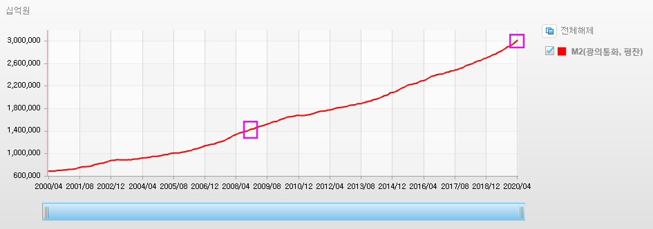 위의 표를 보면 2019년 1년동안 증가한 M2 통화는 180조다.