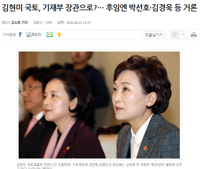 부동산 가격을 폭등 시켜버린 김현미 국토부 장관을 기재부 장관 겸 경제부총리로 승진할 것이란 보도가 나오고 있다.