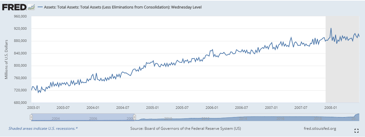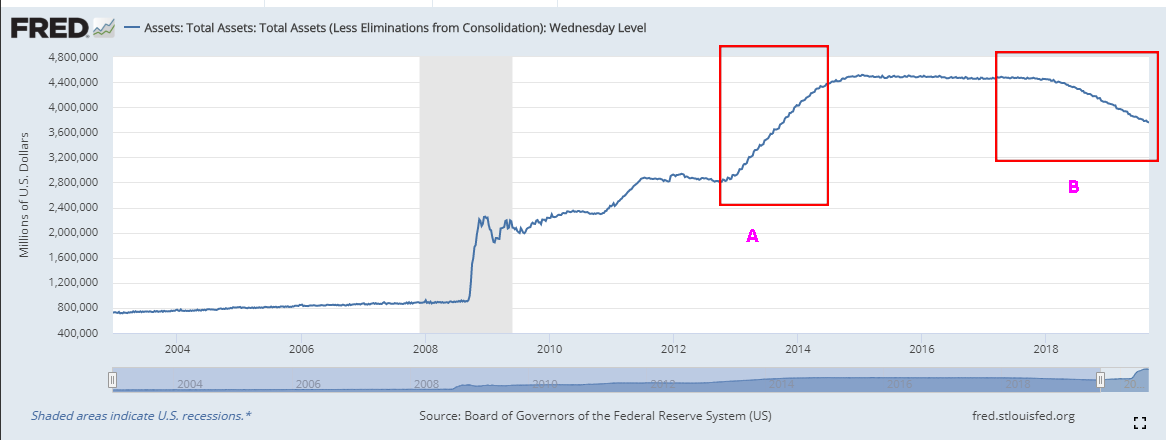 위의 그림은 금융위기 이후 2019년 8월까지 연준 자산추이다..