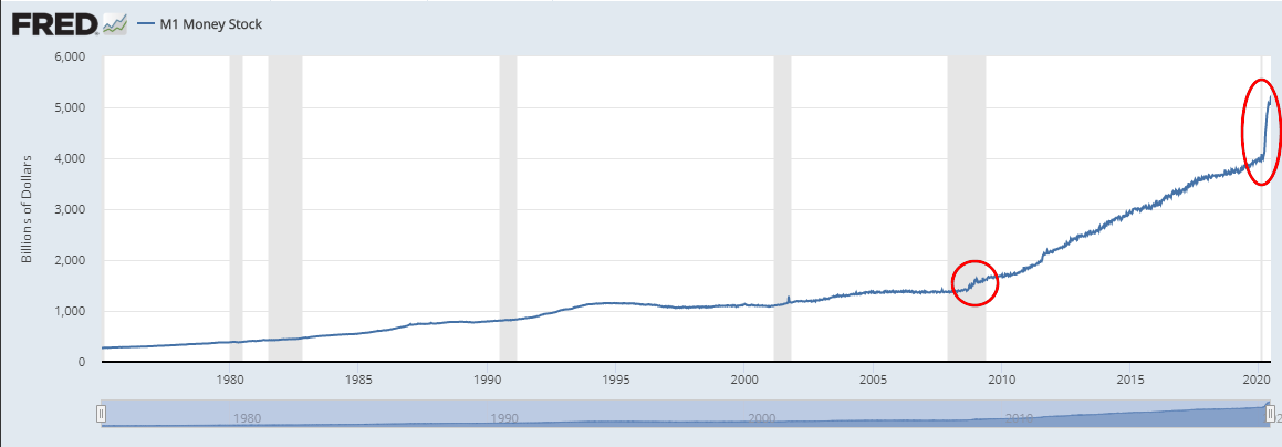 달러 본원통화 M1 차트인데 2008년 금융위기때와 비교도 되지 않을 만큼 많은 돈을 찍었다..
