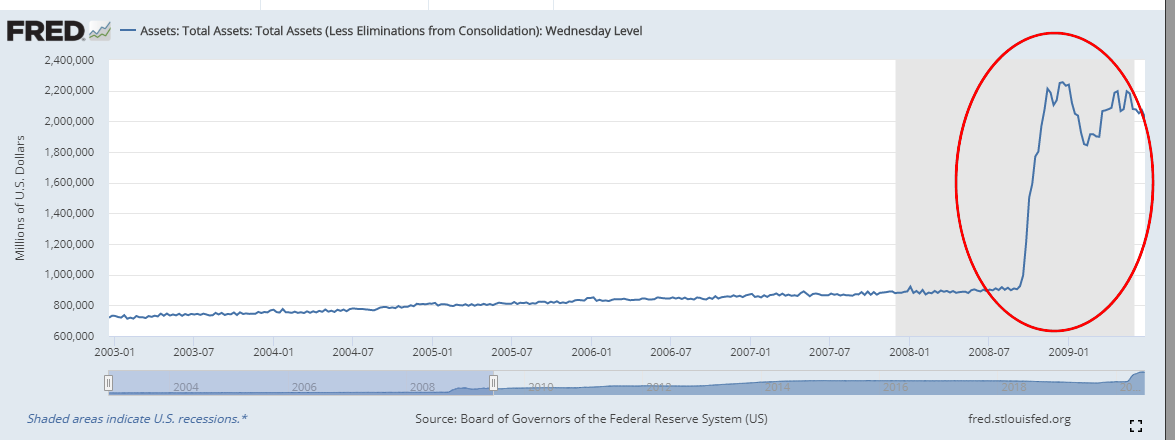 위의 그림에서 보듯이 금융위기 전까지 연준의 자산이 늘어나는 모습은 자연스러웠다..